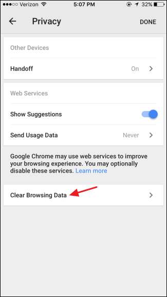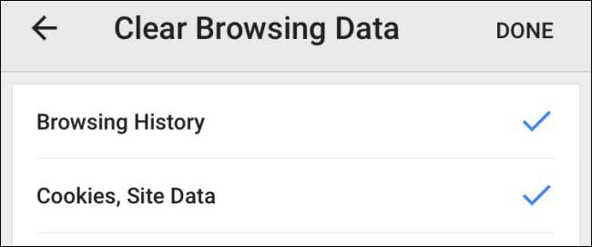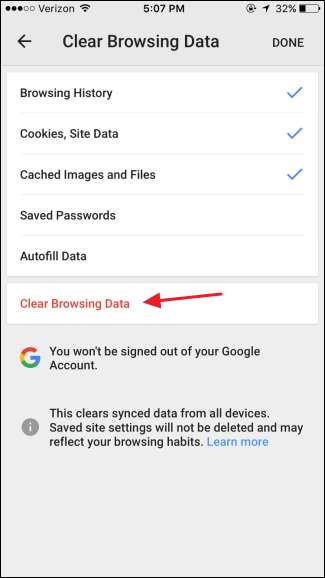 Chrome에서 작업 확인을 요청합니다. "인터넷 사용 기록 삭제"를 탭하여 실행하십시오. 그런 다음 Chrome으로 돌아가거나 종료 할 수 있습니다.