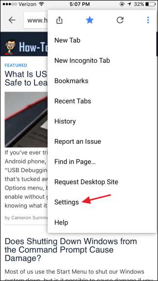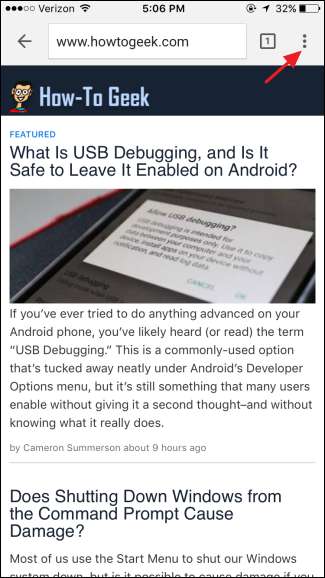 iPhone 또는 iPad의 Chrome에서 인터넷 사용 기록을 지우려면 Chrome 창의 오른쪽 상단에있는 메뉴 버튼 (세로로 된 점 3 개)을 탭합니다.