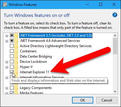 Windows 기능 대화 상자가 표시됩니다. "Internet Explorer 11"상자를 선택 취소합니다.