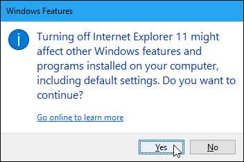 Internet Explorer를 끄면 다른 Windows 기능 및 프로그램에 영향을 미칠 수 있다는 경고 대화 상자가 표시됩니다. Internet Explorer 비활성화를 계속하려면 "예"를 클릭하십시오.