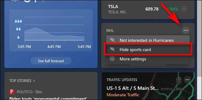 특정 위젯 카드를 특히 보지 않으려면 뉴스 위젯을 열고 숨길 수있는 패널의 오른쪽 상단 모서리에있는 메뉴 버튼 (원의 3 점)을 클릭하십시오.