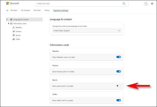 가장자리 브라우저는 Windows 10 News 위젯의 기본 설정을 제어하는 msn.com 웹 사이트에서 "Experience Settings"페이지를 열고로드합니다. "정보 카드"섹션에서 숨길 카드 옆의 스위치를 "OFF"로 뒤집습니다. 이 메뉴에서 숨겨진 카드를 다시 사용할 수도 있습니다.)