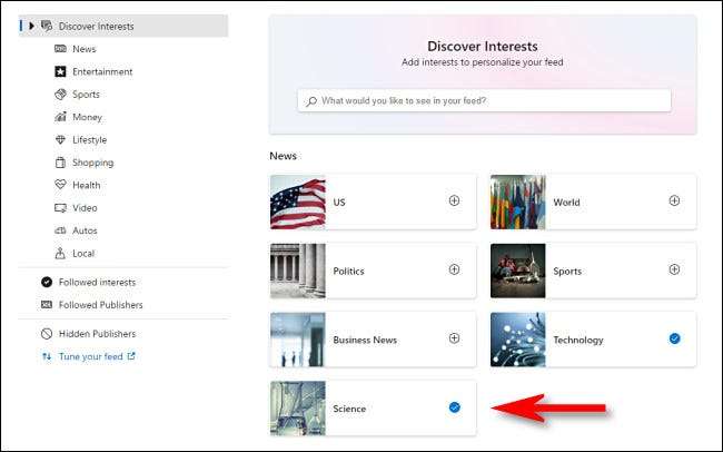피사체별로 관심사를 선택하거나 선택 취소 할 수있는 브라우저에서 특별한 MSN.com 웹 페이지가 열립니다. 사용 가능한 관심사에는 과학, TV, NBA 등이 포함됩니다.