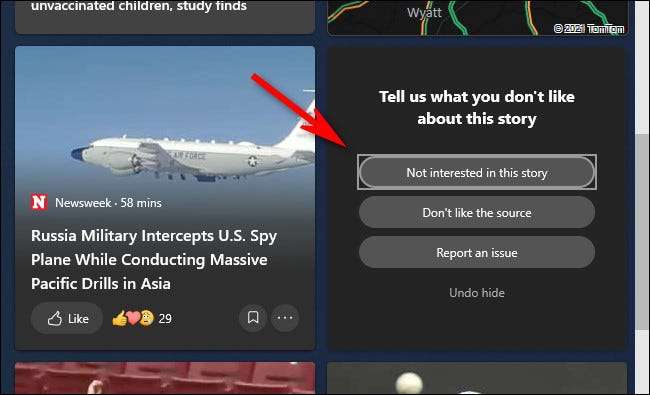 또는 개별 뉴스 카드의 오른쪽 하단 모서리에있는 메뉴 버튼 (원 안의 세 점)을 클릭하여 비슷한 변경을 할 수 있습니다. 거기에서 "좋아요"또는 "싫어", 위젯을이 소스의 뉴스를 숨기려면 위젯을 요청할 수 있습니다.