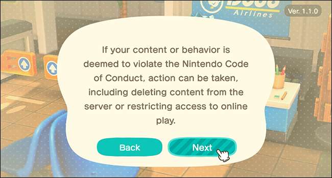 여기에서 Orville은 몇 가지 기본 규칙을 정할 것입니다. 그는 이름, 게임 내 채팅, 게시판 게시물, 섬의 모습, 집의 방, 맞춤형 디자인 및 기타 콘텐츠가 모두 다른 플레이어에게 표시된다는 사실을 상기시켜줍니다.이 모든 것은 Nintendo의 행동 강령 웹 사이트.