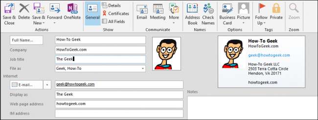 그럼 추격전으로 들어가 적절한 값을 입력하여 How-To Geek에 연락해 보겠습니다. 불필요한 이미지를 추가 할 수도 있지만 평범하고 지루한 주소록에 좋은 터치를 추가 할 수도 있습니다.