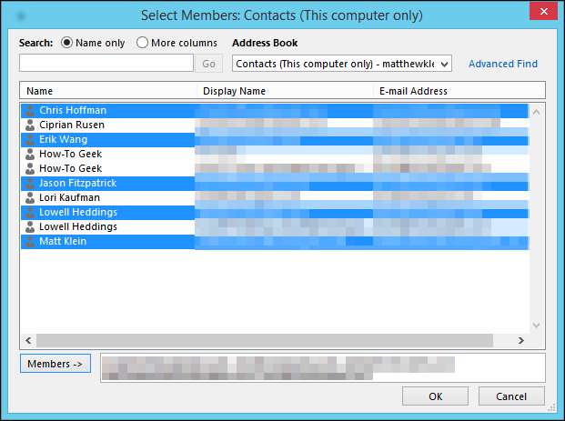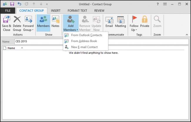 일단 열리면 먼저 그룹 이름을 지정하고 (여기서는 "CES 2015"라고 함) "구성원 추가"를 클릭하고 "Outlook 연락처에서"를 선택해야합니다. 즉석에서 새 연락처를 만들거나 회사 디렉토리에있는 사람들을 포함하려는 경우와 같이 다른 주소록을 선택할 수도 있습니다.