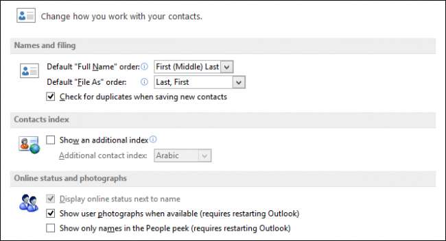 다음은 사람들 옵션입니다. Outlook 옵션의 다른 범주와 달리 사람 옵션은 적고 정렬하기가 매우 쉽습니다.