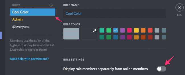 첫 번째 설정 인 "역할 구성원을 개별적으로 표시"는 해당 역할의 사용자가 사용자 패널의 자신의 범주에 표시되도록합니다. 특정 역할에 대해이 설정을 끄면 몇 가지 깔끔한 트릭을 수행 할 수 있습니다. 예를 들어 여러 명의 관리자가 있지만 자신을 다른 색상으로 만들고 싶다면 새 역할을 만들고 관리자보다 위에 둘 수 있지만 완전히 새로운 카테고리를 만들지 않도록 해당 옵션을 해제하면됩니다.
