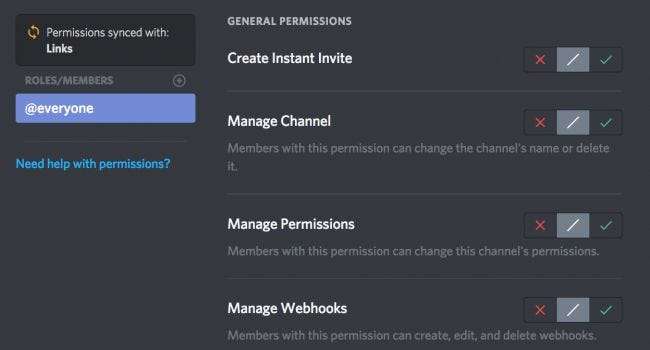 또한 채널에는 고유 한 채널 별 권한이 있으며 채널 옆에있는 톱니 바퀴를 클릭하여 액세스 할 수 있습니다. 이러한 권한은 기본적으로 채널이 속한 카테고리와 동기화되지만 권한을 변경하면 다시 동기화 할 때까지 그대로 유지됩니다.