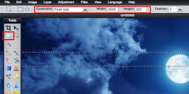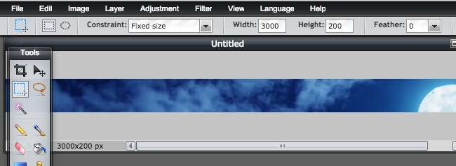 예를 들어, Pixlr에서는 이미지를 열고 직사각형 선택 도구를 선택하고 제약 조건 상자에서 "고정 크기"를 선택한 다음 너비 3000 픽셀과 높이 200을 입력합니다. 그런 다음 적절한 크기의 영역을 선택할 수 있습니다. 이미지의. (물론, 이런 식으로 자르기 전에 이미지 크기를 조정할 수도 있습니다.)