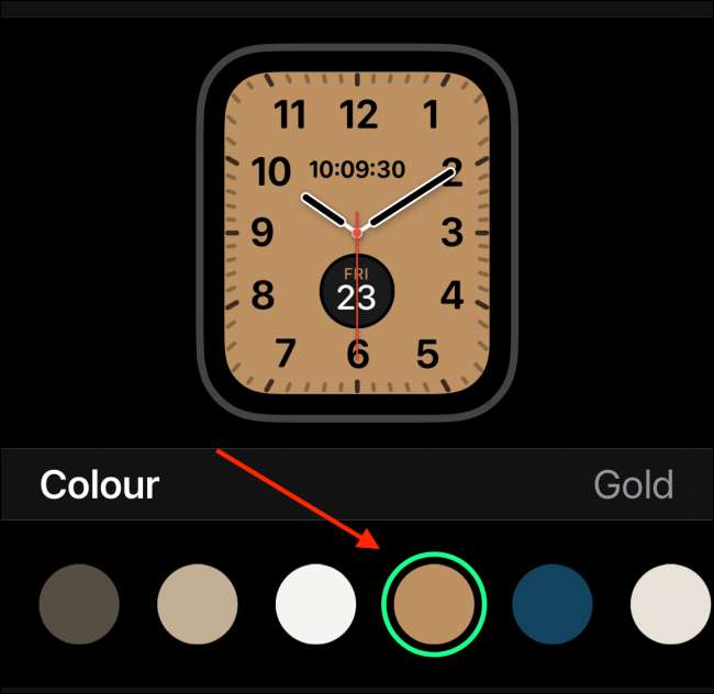 "색상"섹션을 사용자 정의하기 위해 다시 왼쪽으로 스 와이프하십시오. 디지털 크라운을 사용하여 사용 가능한 모든 배경 및 시간 마커 색상 옵션을 순환 할 수 있습니다.