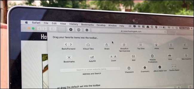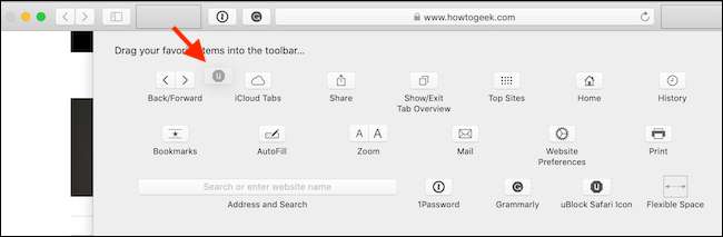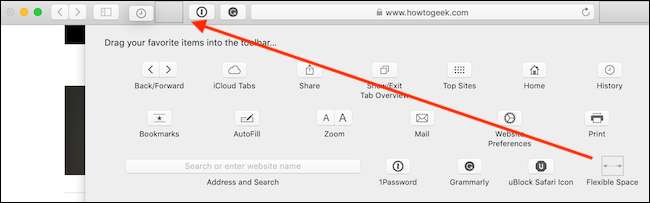 빈 공간을 추가하여 Safari 도구 모음의 모양을 사용자화할 수도 있습니다. 마지막 행에있는 "유연한 공간"버튼을 클릭하고 도구 모음으로 드래그합니다.