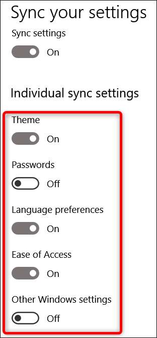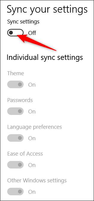 그렇지 않으면 동기화 설정을 모두 비활성화하려면 기본 "동기화 설정"토글을 "끄기"위치로 전환하십시오. 이렇게하면 모든 하위 옵션이 완전히 비활성화됩니다.