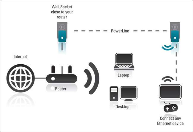 대부분의 사람들은 단순한 쌍 플러그 (또는 집 전체에 몇 개의 추가 플러그가있는 기본 플러그)로 전력선 네트워킹을 사용하지만 원하는 경우 전체 전력선 시스템을 사용할 수 있습니다. 예를 들어 D-Link는 하나 이상의 전력선 지원 라우터 여기서 전체 모뎀-라우터-전력선 설정을 건너 뛰고 모뎀을 라우터-전력선 조합 장치에 바로 연결할 수 있습니다.