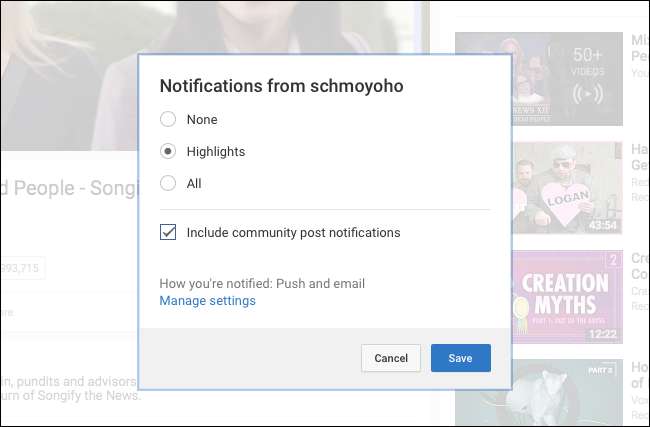 클릭하면 모든 동영상에 대한 알림을 볼 것인지 아니면 하이라이트 만 볼 것인지 묻는 메시지가 표시됩니다.