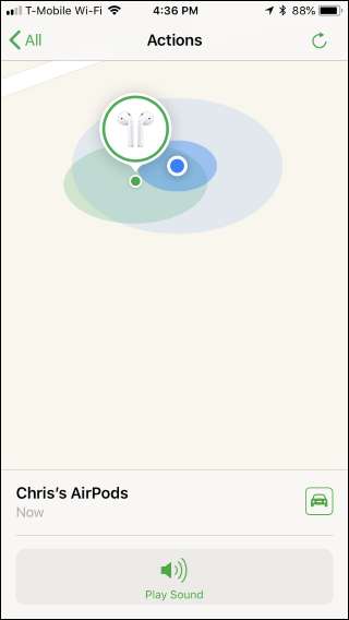 AirPod가 온라인으로 표시되면 목록에서 해당 AirPod를 탭하고지도에서 해당 위치를 볼 수 있습니다. 물론 이것은 iPhone 또는 iPad 근처에 있습니다. "사운드 재생"버튼을 눌러 각 AirPod에서 매우 큰 신호음을 재생합니다. 이렇게하면 근처 어딘가에서 AirPod를 잃어버린 경우 찾을 수 있습니다. 경고음은 작은 AirPod에서 예상되는 것보다 더 크게 들리며 재생 될 때 볼륨이 증가합니다.