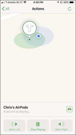 AirPod를 찾은 후 여기에서 "Mute Left"및 "Mute Right"버튼을 눌러 AirPod를 음소거하면 두 번째 AirPod를 더 쉽게 찾을 수 있습니다. AirPods를 찾았을 때 사운드를 중지하려면 "재생 중지"를 탭하십시오.