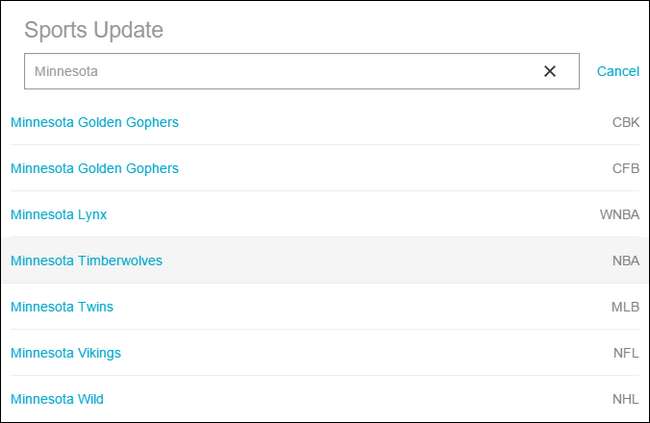 같은 지역의 모든 팀을 사용하고 있지만 여러 검색을 사용하여 팀을 쉽게 혼합하고 일치시킬 수 있습니다. 따라 잡으려는 팀을 선택한 후에는 Alexa에서 다양한 명령을 사용하여 스포츠 업데이트를받을 수 있습니다.