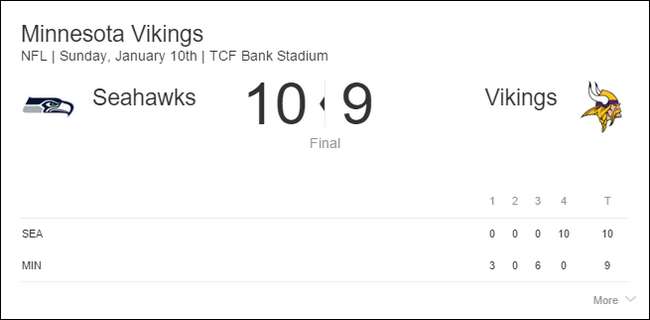 "Alexa, 스포츠 업데이트"를 통해 일반 업데이트를 요청하면 팔로우하는 시즌 중 팀의 최신 경기에 대해 알려줄 것입니다. "Alexa, Vikings는 어때?"와 같은 특정 스포츠 업데이트를 요청할 수도 있습니다. 그리고 그녀는 그들이 마지막으로 플레이 한 게임에 대한 정보와 해당되는 경우 다음에 플레이 할시기에 대한 정보를 제공합니다. 날씨 및 교통 업데이트와 마찬가지로 Alexa는 위와 같이 구두 쿼리 후 관련 정보가 포함 된 카드를 만듭니다.