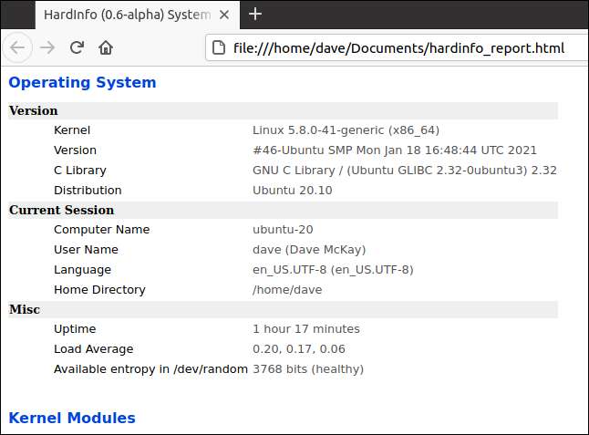 "열기"버튼 HardInfo 시작을 클릭하면 기본 웹 브라우저가 보고서를 표시합니다.