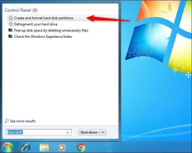 Windows 7에서 열려면 시작 메뉴를 열고 검색 상자에 "하드 디스크"를 입력 한 다음 "하드 디스크 파티션 생성 및 포맷"바로 가기를 클릭합니다.