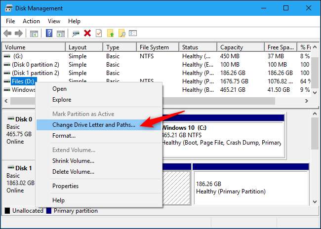 해당 파티션을 마우스 오른쪽 단추로 클릭 한 다음 "드라이브 문자 및 경로 변경"명령을 선택합니다.