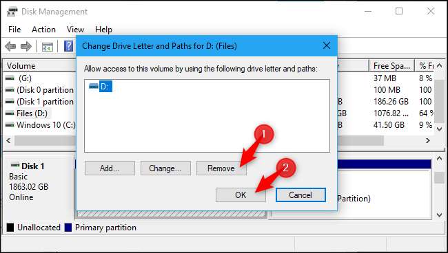 나타나는 창에서 제거 할 드라이브 문자를 선택하고 "제거"단추를 클릭 한 다음 "확인"단추를 클릭하십시오.