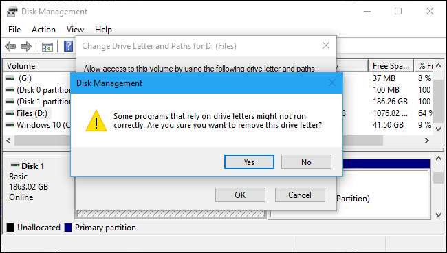 Windows는 드라이브 문자를 제거하면 프로그램이 올바르게 실행되지 않을 수 있음을 경고합니다. 예를 들어이 드라이브에 응용 프로그램을 설치했거나 중요한 파일을 저장 한 경우 드라이브에 문자가 할당되지 않은 동안에는 해당 드라이브에 액세스 할 수 없습니다.