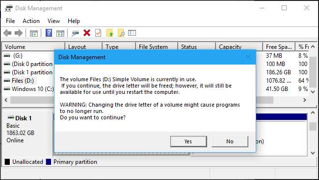 드라이브가 현재 사용중인 경우 프로세스를 완료하려면 PC를 다시 시작해야한다는 경고가 표시됩니다. 다시 "예"를 클릭 한 다음 PC를 다시 시작하십시오. 이 프로세스를 마치면 Windows에 드라이브가 표시되지 않습니다.