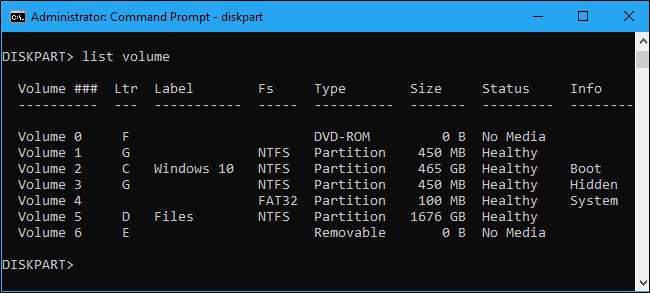 프롬프트가 "DISKPART>"로 변경되어 현재 해당 도구에 있음을 나타냅니다. 다음 명령을 입력 한 다음 Enter 키를 눌러 컴퓨터에 연결된 볼륨을 나열합니다.