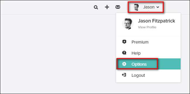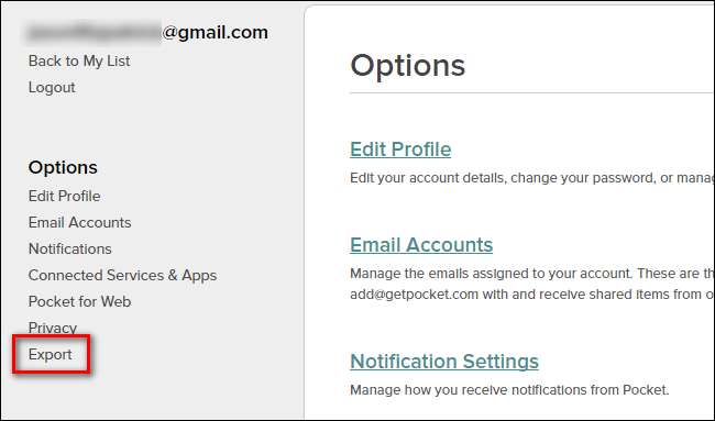 Instapaper를 사용해보고 싶다면 Pocket 콘텐츠를 내 보내서 가져와야합니다. 그렇게하려면 방문하십시오 getpocket.com , 로그인 한 다음 사용자 이름과 "옵션"을 클릭하여 옵션 메뉴를 방문하십시오.