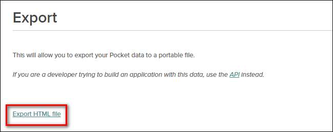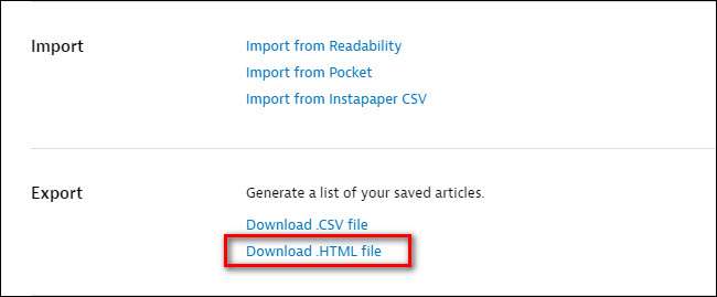 파일은 "instapaper-export.html"로 저장됩니다. 파일을 컴퓨터에 안전하게 다운로드 한 후 getpocket.com으로 이동하여 로그인하거나 새 계정을 만드십시오. 서비스에 로그인하면 옵션 메뉴를 탐색하여 Instapaper 파일을 가져 오는 대신 다음을 수행해야합니다. 이 링크를 직접 방문하십시오 .
