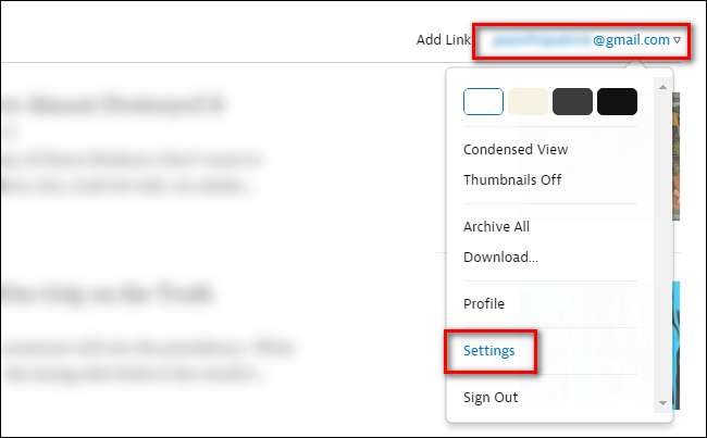 방문을 시작하려면 instapaper.com , 로그인하고 오른쪽 상단 모서리에있는 사용자 이름을 클릭하고 설정을 선택합니다 (또는 사용자 설정으로 바로 이동할 수 있습니다. 여기 ).