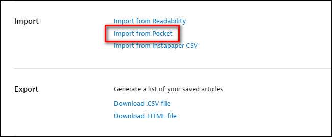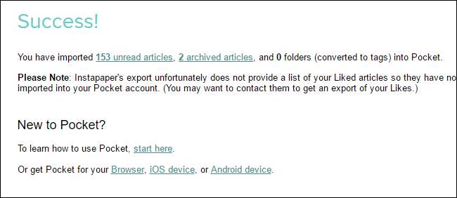 여기서 주목할 두 가지가 있습니다. 먼저 여기 Pocket에 건네 줘야합니다. 사용자 친 화성 관점에서 그들은 스플래시 페이지 가져 오기를 사용했습니다. 둘째, Instapaper에서 가져온 내보내기 파일의 일부가 아니기 때문에 Instapaper 좋아하는 항목을 가져 오지 못한 방법에 대한 메모가 표시됩니다. Instapaper의 도움말 파일에서이 문제에 대한 정보를 찾지 못했기 때문에 정말 좋아하는 기사가 필요한 경우 Instapaper 기술 지원에 직접 연락하여 문제를 해결해야하는 것 같습니다.