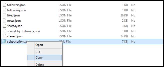 파일 다운로드가 완료되면 ZIP 파일로 이동하여 subscriptions.xml 파일을 컴퓨터의 안전한 위치에 복사하여 나중에 사용할 수 있도록합니다.