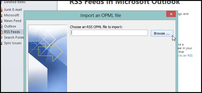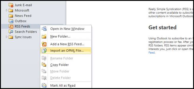 그런 다음 Outlook을 열고 RSS 피드 섹션을 마우스 오른쪽 버튼으로 클릭 한 다음 상황에 맞는 메뉴에서 "OPML 파일 가져 오기…"를 선택합니다.