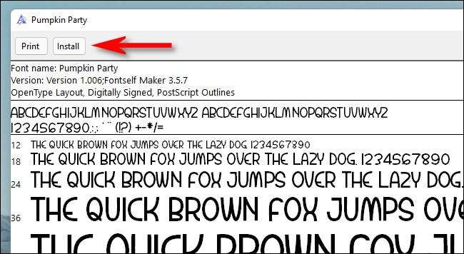 Windows는 특수 글꼴 미리보기 창에서 글꼴 샘플을 엽니 다. 글꼴을 설치하려면 "설치"를 클릭하십시오. 그러면 자동으로 글꼴 파일을 Windows 시스템 글꼴 폴더로 이동합니다 (