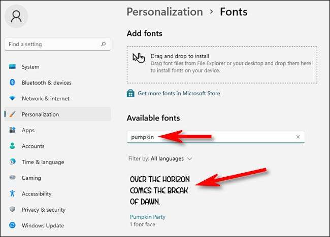 글꼴 설정에서 "사용 가능한 글꼴"섹션에 설치된 모든 글꼴 목록이 표시됩니다. 제거하려는 것을 빠르게 찾으려면 (이름을 알고있는 경우) "여기에서 검색 할"상자를 클릭하십시오. "를 클릭 한 다음 제거 할 글꼴의 이름을 입력하십시오. 목록에 나타나면 클릭하십시오.