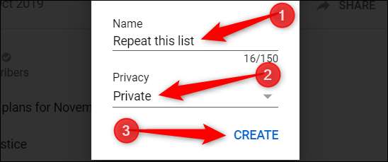 그런 다음 재생 목록의 이름을 지정하고 개인 정보를 설정 한 다음 "만들기"버튼을 클릭합니다.
