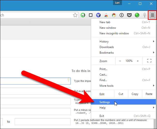 마지막으로 Chrome을 열었을 때 열었던 탭을 자동으로 다시 열려면 Chrome 메뉴 버튼 (세 개의 가로 막대)을 클릭하고 '설정'을 선택합니다.