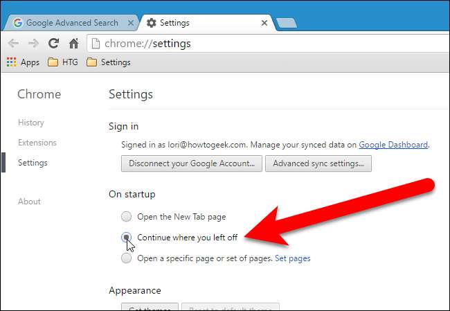 선택하지 않은 경우 설정 화면이 새 탭에서 열립니다. 별도의 창에서 Chrome 설정 열기 . 시작시 섹션에서 "중단 한 부분에서 계속"옵션을 선택합니다.