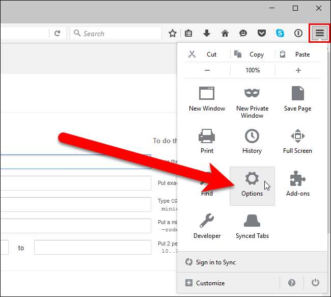 Firefox는 마지막 브라우징 세션에서 어떤 탭이 열려 있었는지뿐만 아니라 Firefox 창이 여러 개 열려있는 경우 열려 있던 모든 창을 기억합니다. 마지막 Firefox 브라우징 세션에서 열려 있던 모든 창과 탭을 자동으로 열려면 창의 오른쪽 상단 모서리에있는 Firefox 메뉴 버튼 (세 개의 가로 막대)을 클릭하고 드롭 다운 메뉴에서 "옵션"을 클릭합니다.