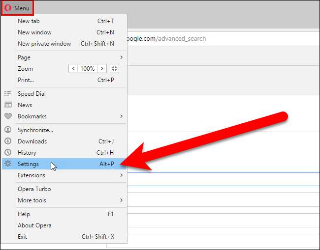 Opera가 마지막 세션에서 탭을 열도록하려면 브라우저 창의 왼쪽 상단 모서리에있는 Opera 메뉴를 클릭하고 드롭 다운 메뉴에서 "설정"을 선택하십시오.