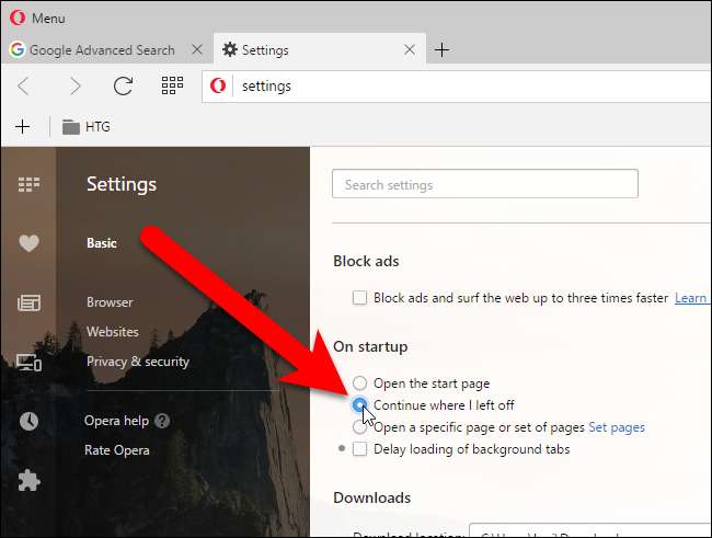 설정이 새 탭에 표시됩니다. 기본 화면의 시작시 섹션에서 "중단 한 부분에서 계속"옵션을 클릭합니다.