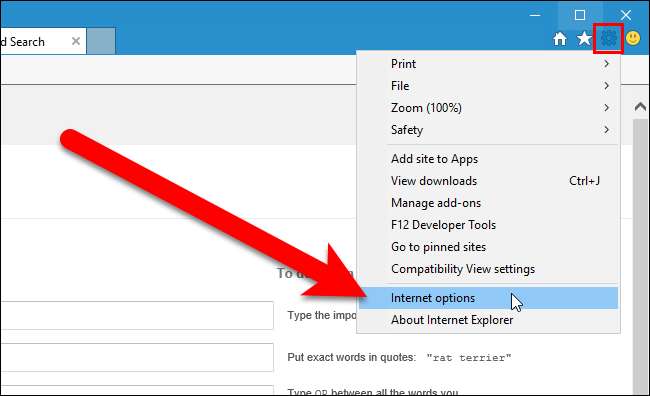 Internet Explorer에서 마지막 탐색 세션의 모든 탭을 열려면 창의 오른쪽 상단 모서리에있는 톱니 바퀴 버튼을 클릭하고 드롭 다운 메뉴에서 "인터넷 옵션"을 선택합니다.