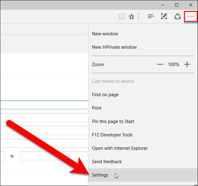 Microsoft Edge에서 마지막 탐색 세션의 모든 탭을 열려면 창의 오른쪽 상단 모서리에있는 메뉴 버튼 (점 3 개)을 클릭하고 드롭 다운 메뉴에서 "설정"을 선택합니다.