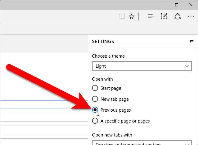 설정 창은 브라우저 창의 오른쪽에 표시됩니다. 연결 프로그램에서 "이전 페이지"를 선택합니다. 설정 창 오른쪽의 아무 곳이나 클릭하여 닫습니다.