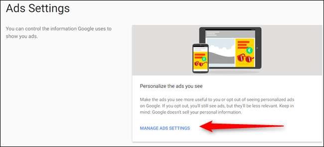 이렇게하면 계정의 광고 설정 페이지가 열리지 만 여기로 이동할 수있는 또 하나의 후프가 있습니다. '광고 설정 관리'를 클릭하여 실제 고기와 감자를 확인하세요.