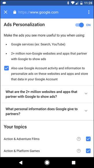 Android 사용자이고 컴퓨터 앞에서 설정을 조정하는 것을 원하지 않는 경우 설정> Google> 개인 정보 및 개인 정보 보호> 광고 설정에서 동일한 정보를 찾을 수 있습니다. 기본적으로 웹의 내 계정 아래에있는 광고 설정 페이지로 연결되는 빠른 링크이므로 위에 강조 표시된 것과 동일한 결과가 여기에 표시되어야합니다. 따라서 위에 나열된 지침을 따르십시오.